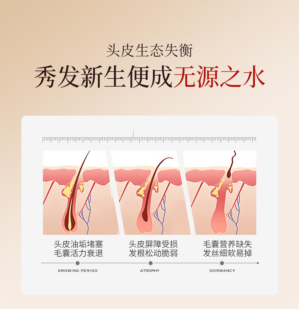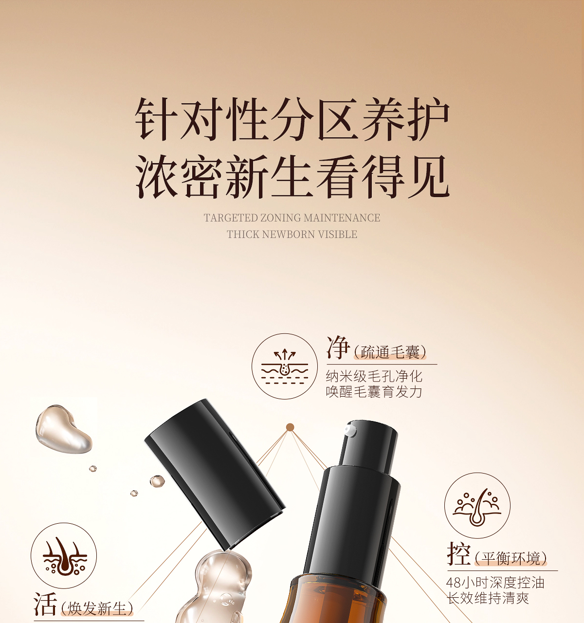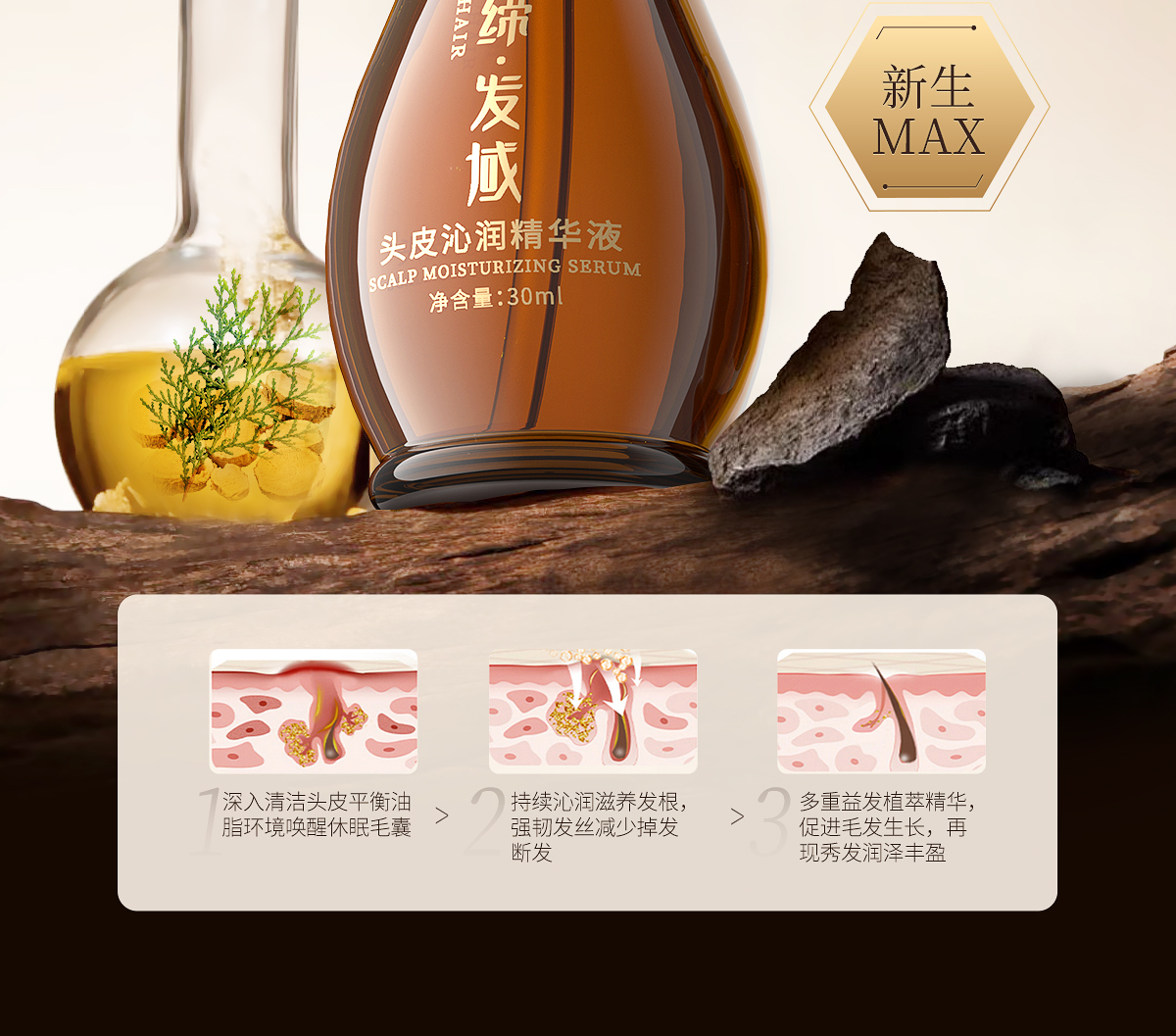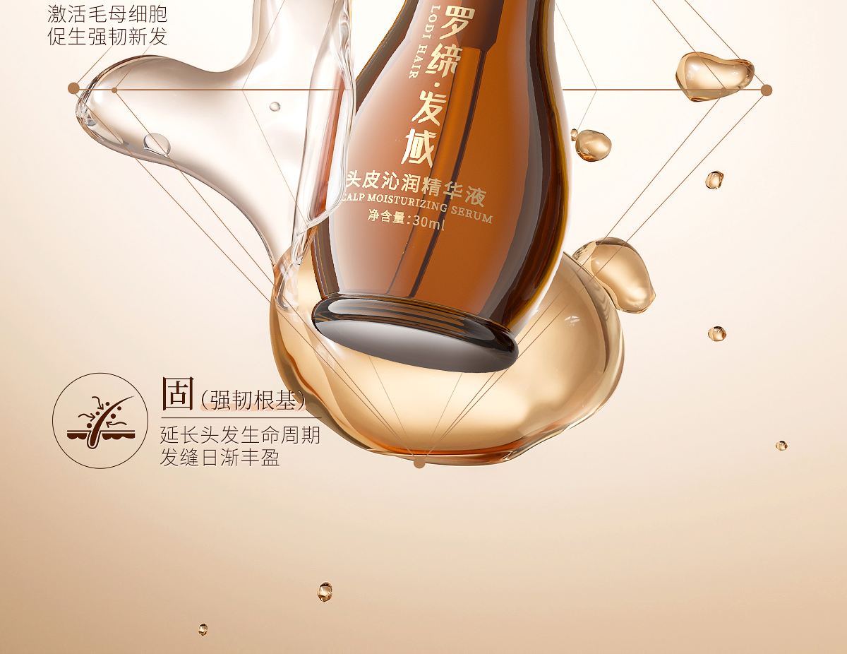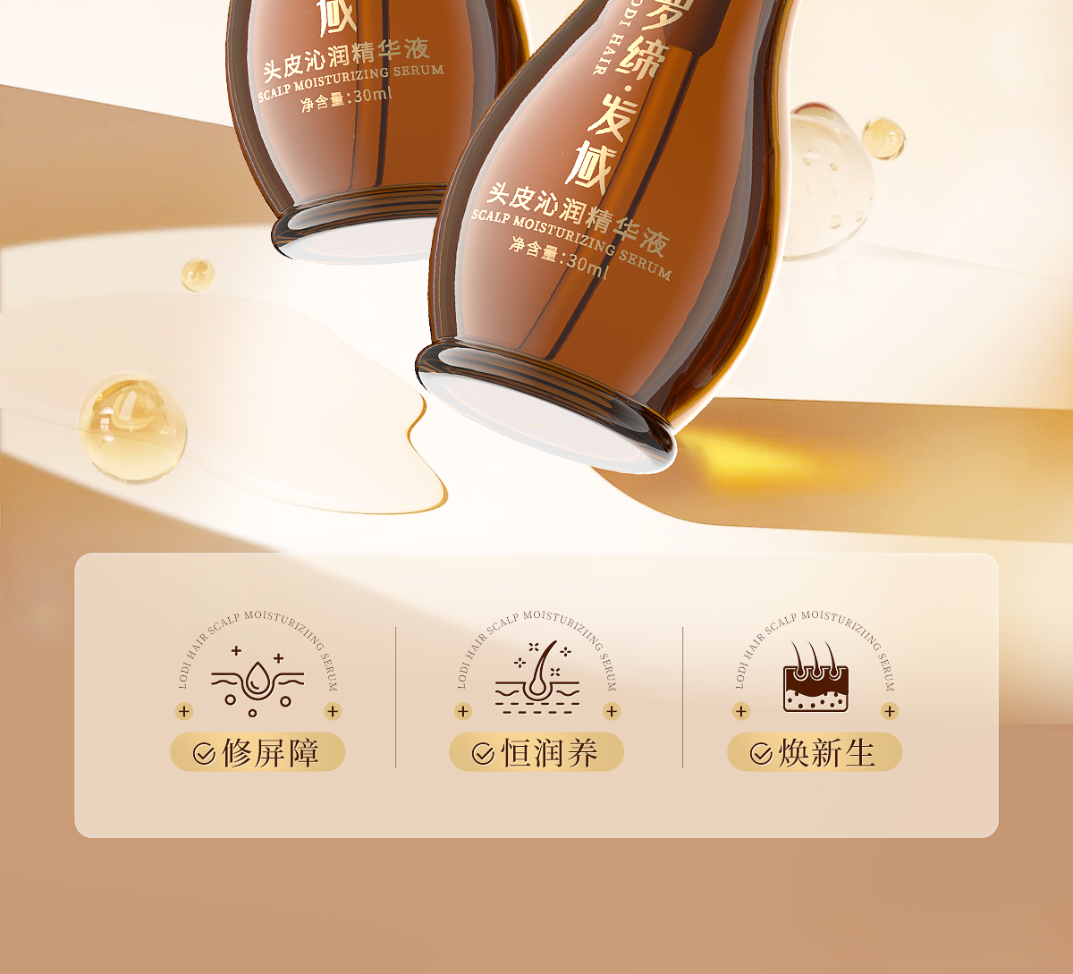 SCALP MOISTURIZING SERUM适宜人群:各种类型脱发人群。 作 用:含有侧柏叶、何首乌、光果甘草等草本植萃,高阶滋润头皮,净澈头皮环境,持续呵护发根,令头发丰盈、发丝莹润亮泽。