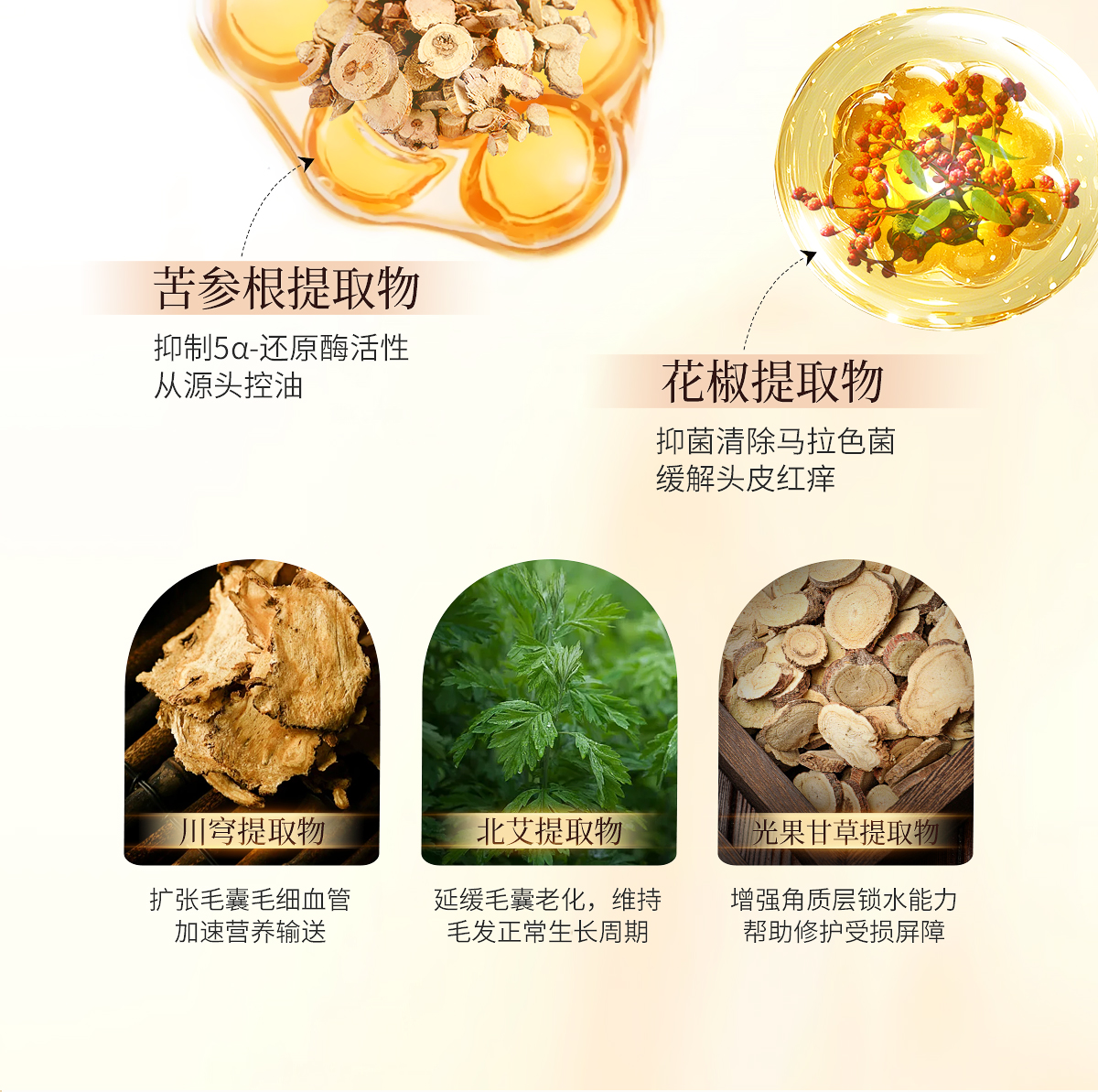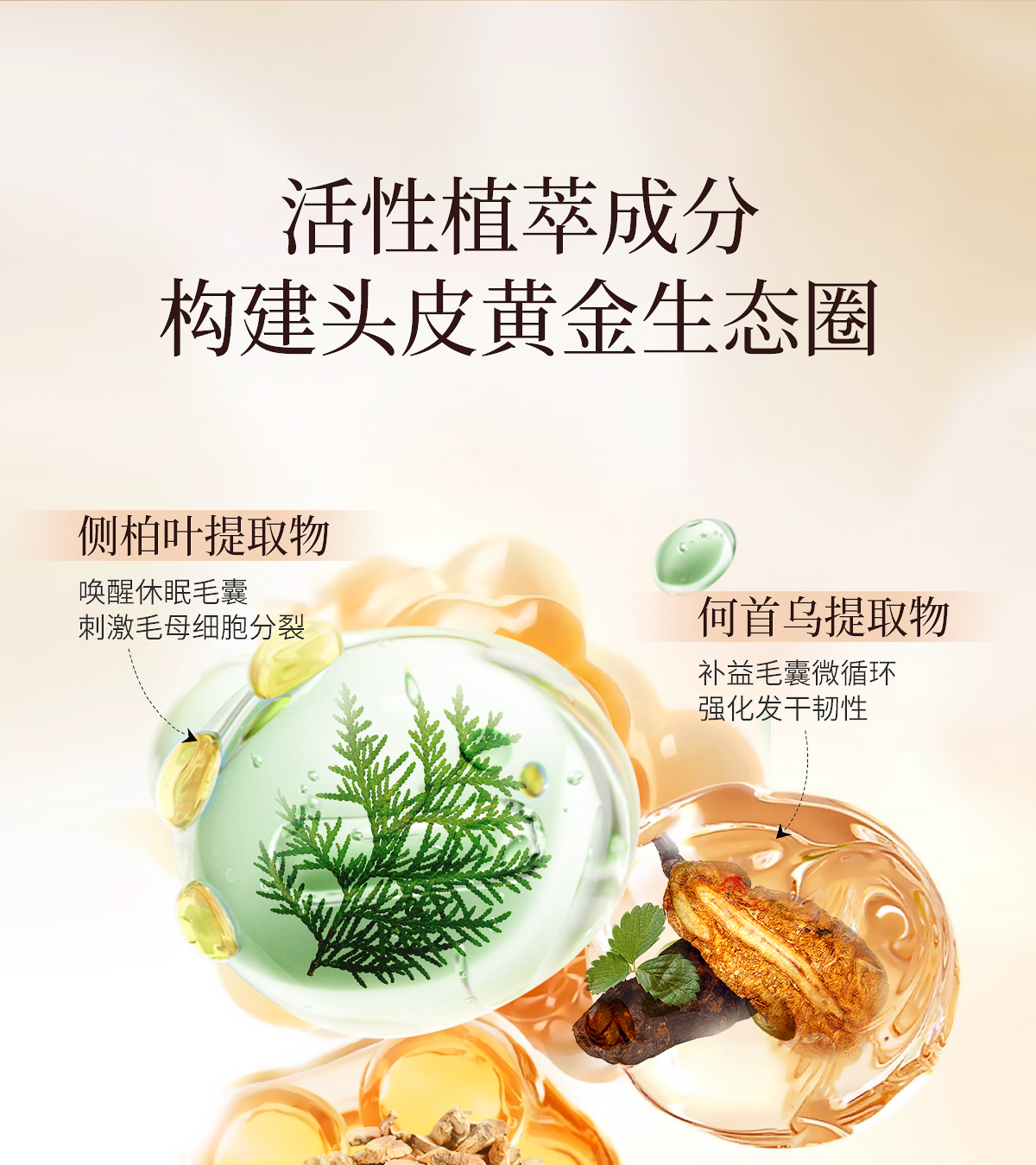 适宜人群:各种类型脱发人群。 作 用:含有侧柏叶、何首乌、光果甘草等草本植萃,高阶滋润头皮,净澈头皮环境,持续呵护发根,令头发丰盈、发丝莹润亮泽。