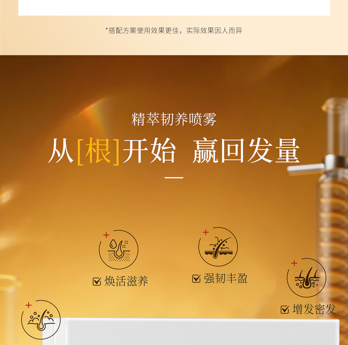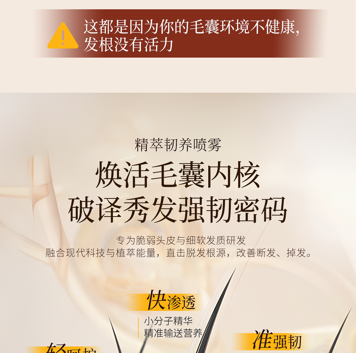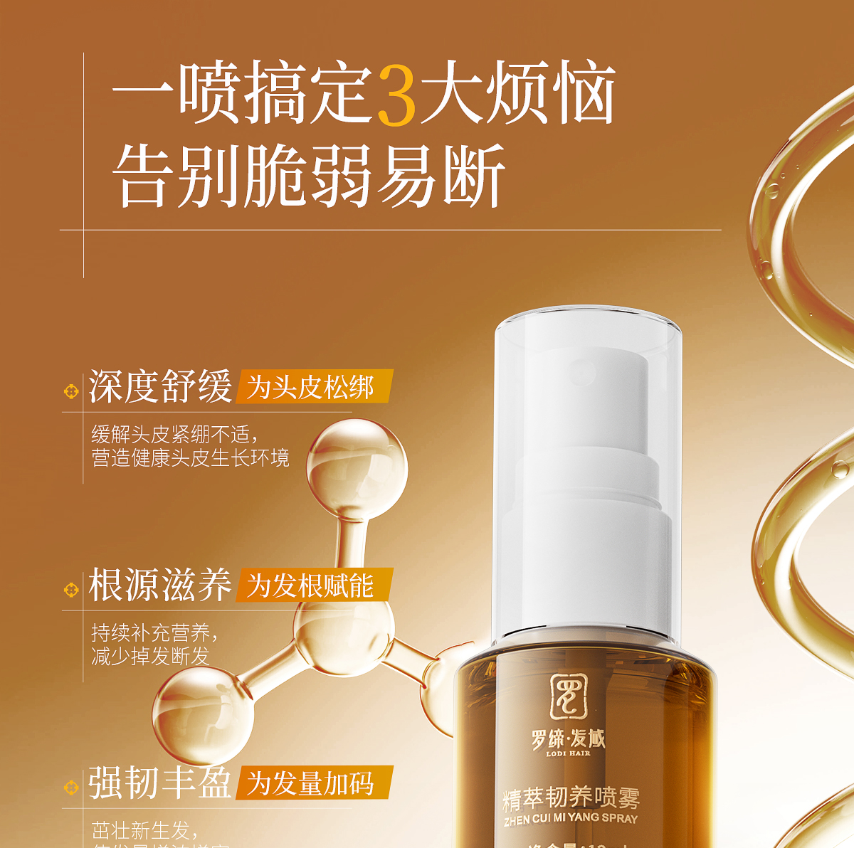 适宜人群:各种类型脱发人群。 作 用:精萃护发成分,滋养修护发丝,改善发丝分叉,减少断发,令秀发柔顺丝滑